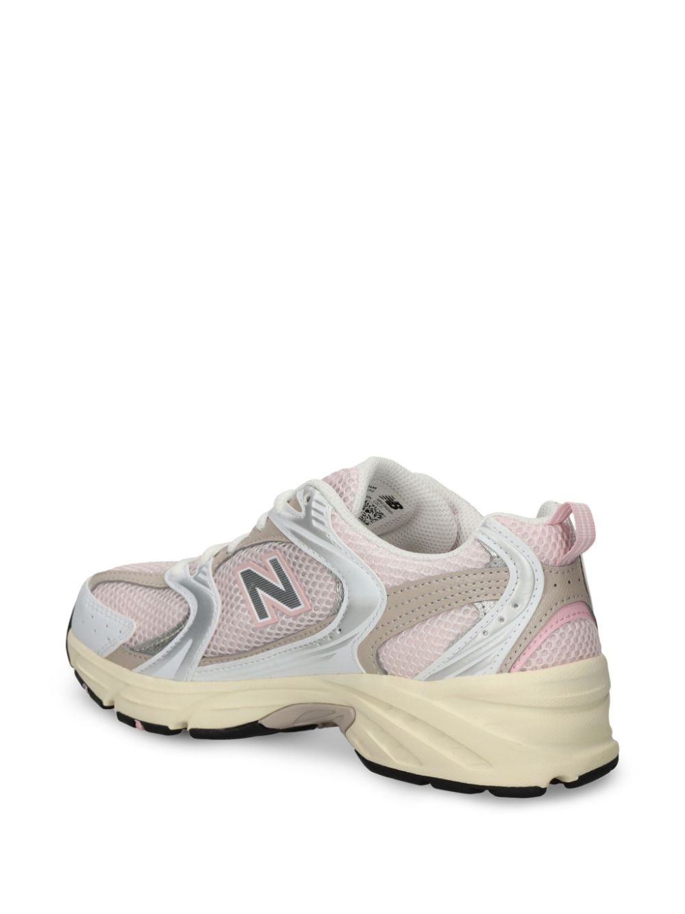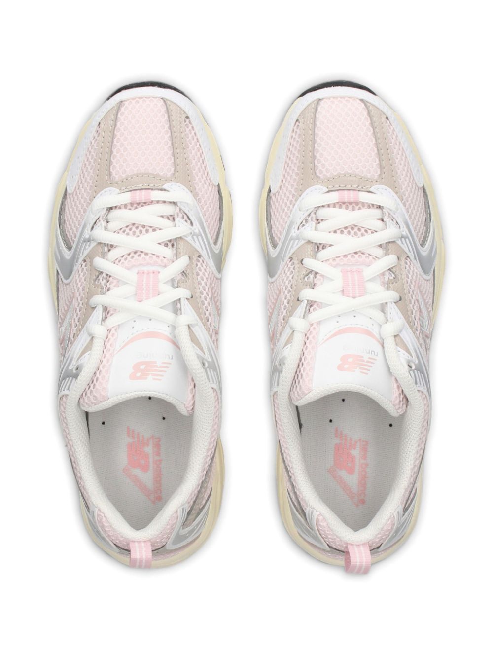 NEW BALANCE 530 סניקרס לנשים וגברים יוניסקס הכולל את סמל המותג ניו באלאנס, שרוכי קשירה, לשונית נמוכה ומרופדת, סוליית גומי אלסטית, חלק עליון עשוי מעור עם תפירות ורשת משתלבת.
