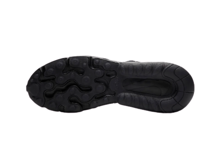 נעלי נייק Nike מדגם Air Max 270 React עם סוליית גומי יחודית בשילוב יחידת אוויר ובולם לריכוך הצעדים. לנעליים בד רשת לאוורור, שרוכי קשירה ולוגו נייקי מופיע על צידי הנעל ומאחור.